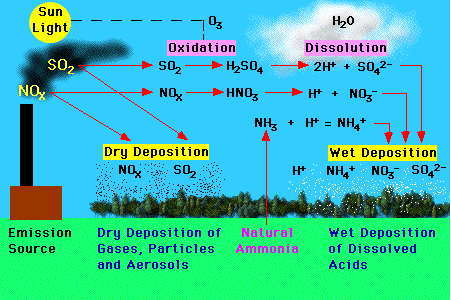 Several processes can result in the formation of acid deposition. Nitrogen oxides (NOx) and sulfur dioxide (SO2) released into the atmosphere from a variety of sources call fall to the ground simply as dry deposition. This dry deposition can then be converted into acids when these deposited chemicals meet water. Most wet acid deposition forms when nitrogen oxides (NOx) and sulfur dioxide (SO2) are converted to nitric acid (HNO3) and sulfuric acid (H2SO4) through oxidation and dissolution. Wet deposition can also form when ammonia gas (NH3) from natural sources is converted into ammonium (NH4).